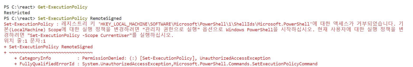 시도하니 오류가 다시 발생했고, Set-ExecutionPolicy -Scope CurrentUser를 실행하라고 쓰여있어서 실행했습니다.