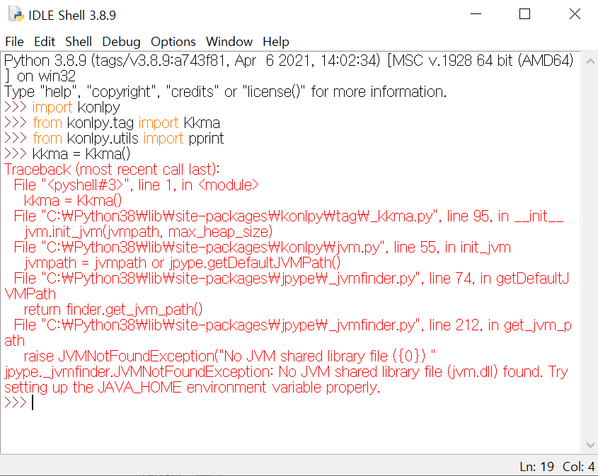 [오류 해결] JPYPE - SystemError: java.nio.file.lnvalidPathException: lllegal char <*> at index 42: C:\Python38\Lib\site-packages\konlpy\java\*