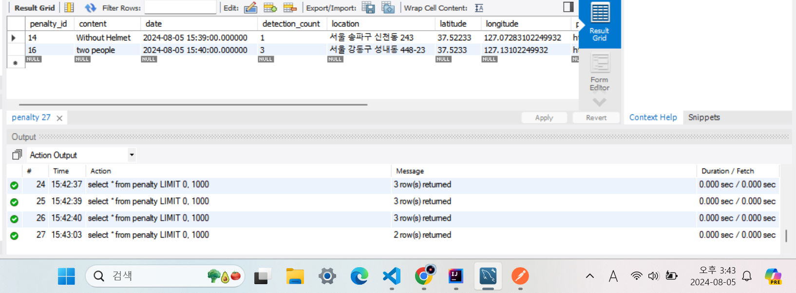 이때 시간은 오후 3:43, 등록된지 5분이 지난 데이터는 삭제되었다.