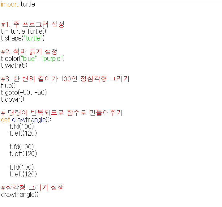 : 터틀 그래픽을 하기 위해서는 터틀 모듈을 가져와야 하는데, 모듈을 가져오는 명령 import를 해준다.