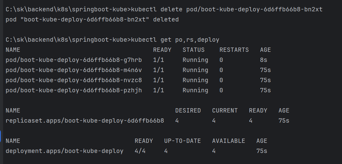spec: replicas: 4 이기 때문에 바로 새로운 pod가 생긴다. (g7hrb가 새로운 pod이다.)