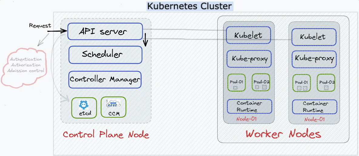 클러스터의 구성은 크게 마스터 노드(Control Plane, 제어 플레인)과 워커 노드(Worker node, 일반 노드)로 나뉜다.
