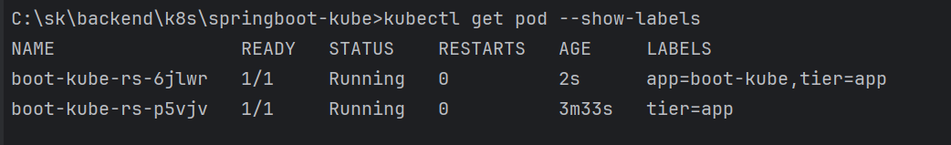 해당 pod의 라벨을 제거하자, ReplicaSet에 해당하는 조건의 pod가 사라져서 새로운 pod인 boot-kube-rs-6jlwr가 생겼다.
