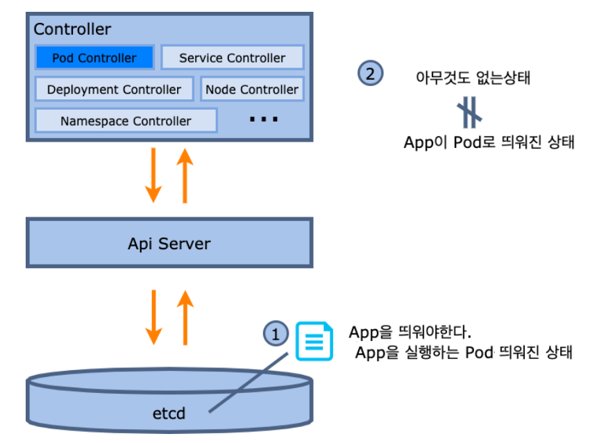 API Server → Controller (상태(desired status) 점검 해라 명령) → API Server에게 보고