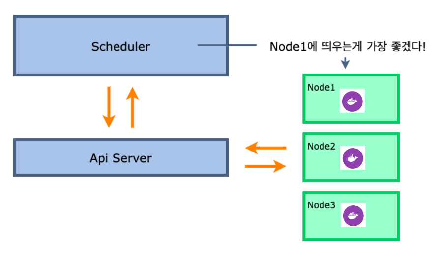 API Server → Schedular (Pod를 어느 Node에 배치할지 결정) → API Server에게 보고