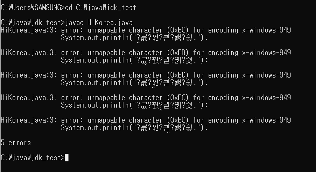 [JAVA] java cmd compile error : unmappable character (0xEC) for encoding x-windows-949 원인 파악, 설명과 문제해결