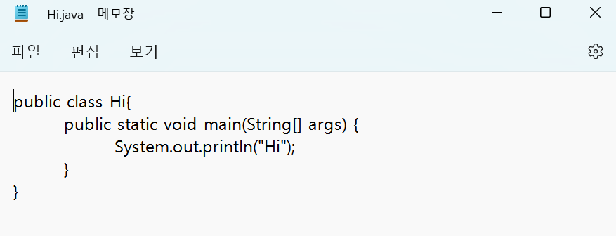 Hi를 출력할 목적이고, 파일명은 Hi.java입니다.
