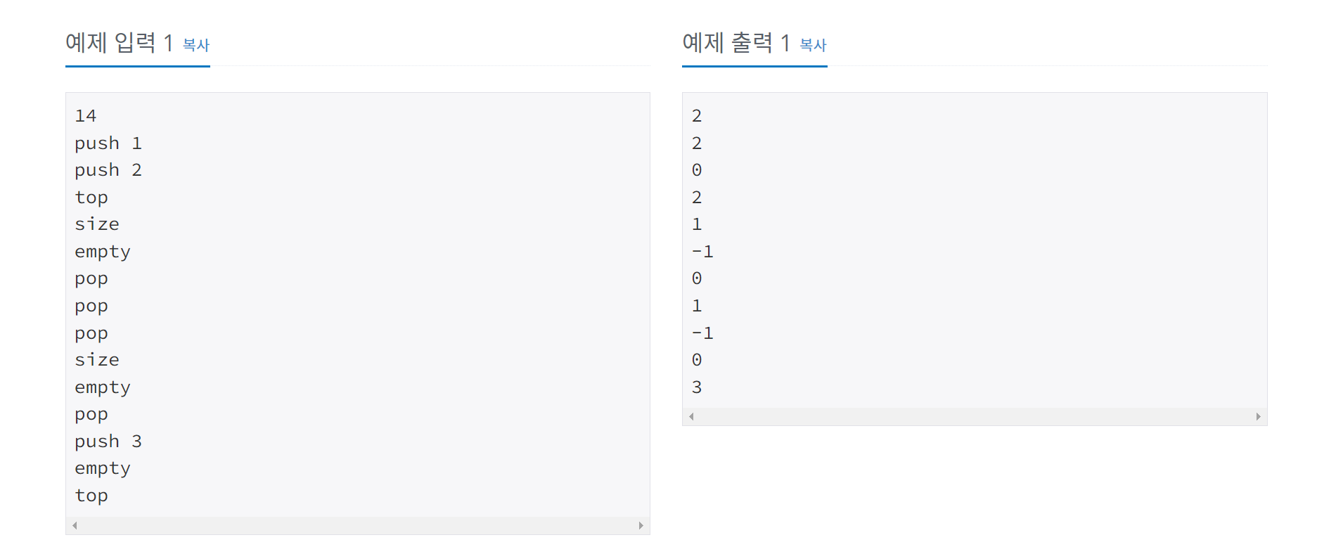 - empty: 스택이 비어있으면 1, 아니면 0을 출력한다.