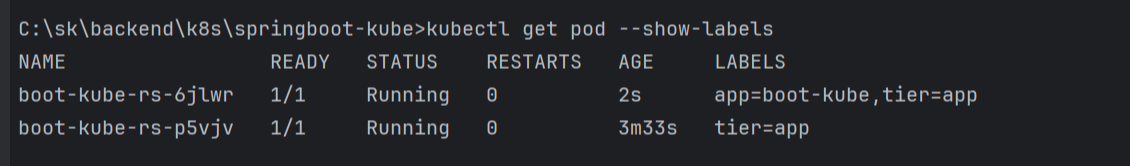해당 pod의 라벨을 제거하자, ReplicaSet에 해당하는 조건의 pod가 사라져서 새로운 pod인 boot-kube-rs-6jlwr가 생겼다.