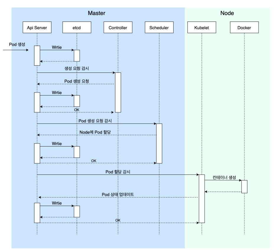 API Server → etcd (pod 리소스 정보 저장) → pod 상태가 클러스터 상태에 등록됨